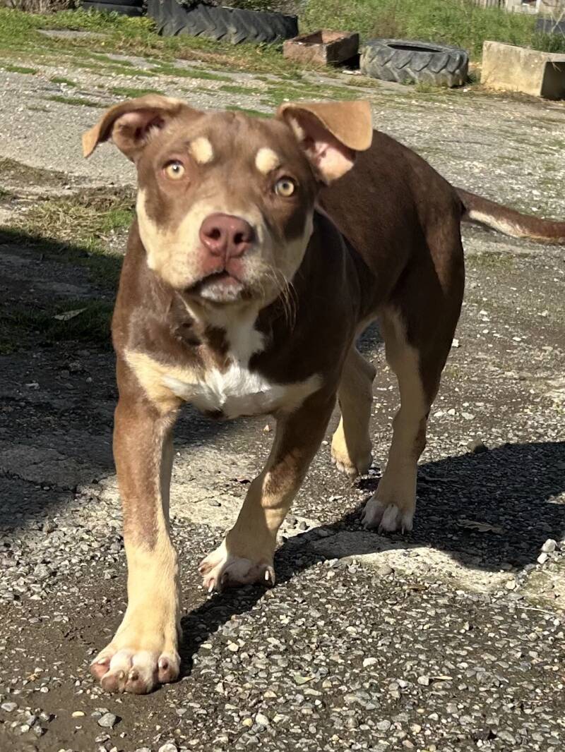 Sa robe se distingue par une superbe couleur chocolat, accompagnée de marquages plus clairs au niveau des sourcils, des pattes et du poitrail, ainsi que d'une touche de blanc légère. Cette combinaison de couleurs lui donne un style unique et met en valeur ses traits et son regard intense.