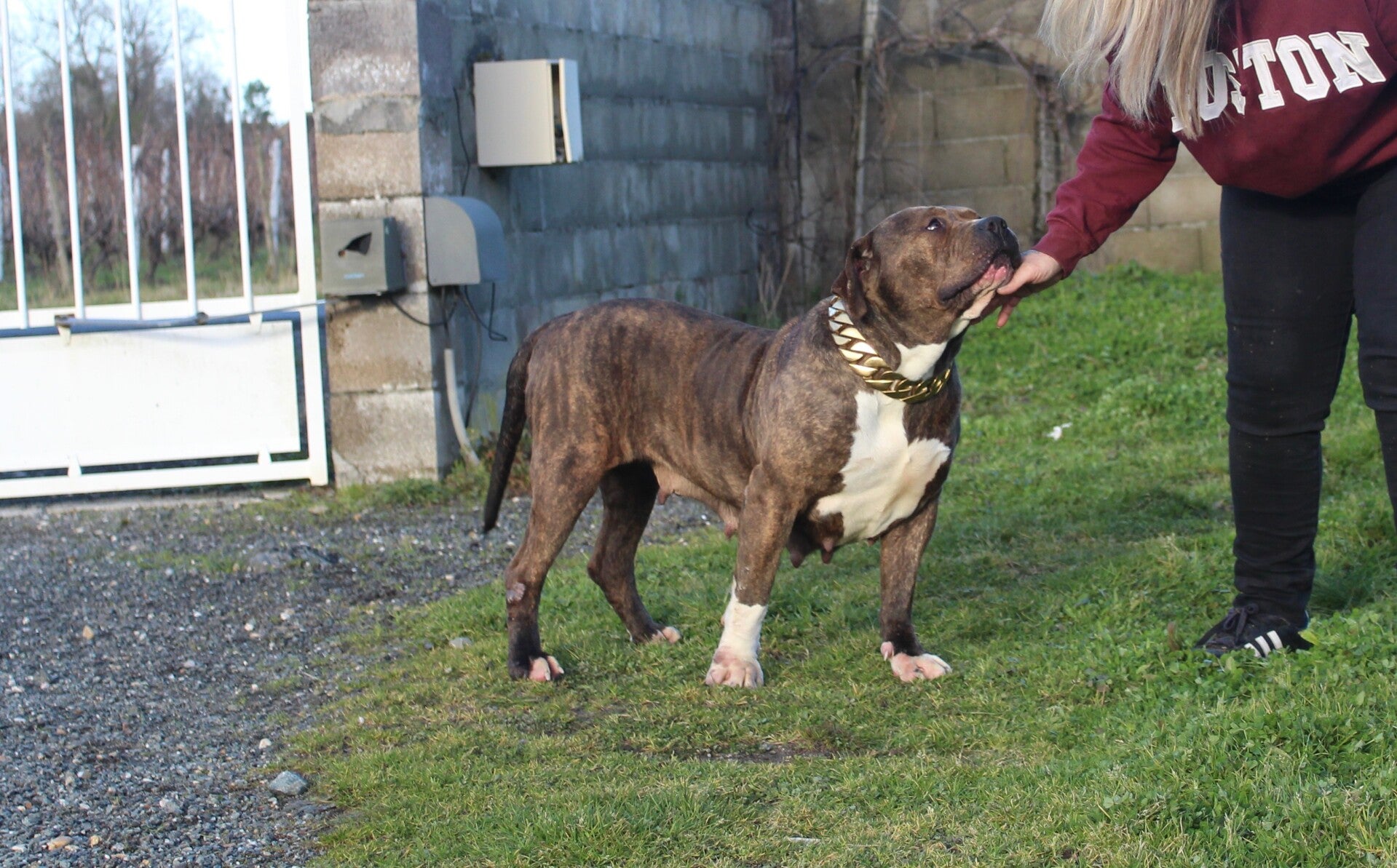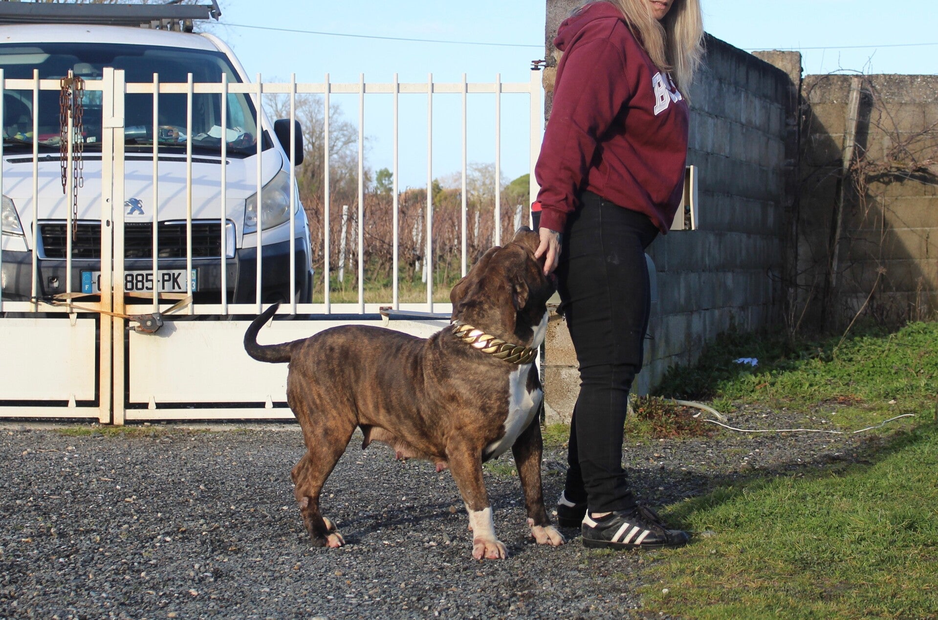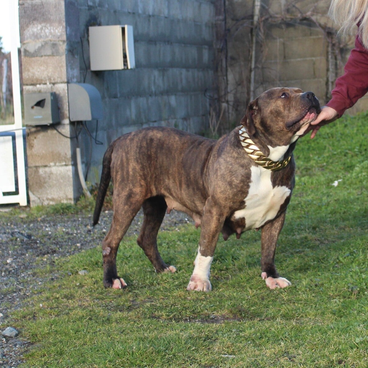 Mustang est une chienne qui impressionne par sa stature imposante et sa musculature, typiques de la race American Bully. Pourtant, derrière cette apparence robuste se cache une douceur incroyable. Elle adore les câlins et apporte bonheur et réconfort à tous ceux qu'elle rencontre.